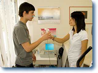 Beim Lungenfunktionstest werden verschiedene Lungenfunktionswerte gemessen, die den Arzt über eventuell bestehende Lungenfunktionsstörungen, z.B. Lungenemphysen oder andere Belüftungsstörungen Ihrer Lunge bei Atemnot (Asthma bronchiale) informieren können. Beim Lungenfunktionstest wird normalerweise die Durchgängigkeit des bronchialen Systems gemessen. Die Technik der Lungenfunktionsdiagnostik ist für jeden Patienten einfach und schnell unter Anleitung einer speziell ausgebildeten medizinischen Fachkraft durchführbar. Wir vereinbaren gerne einen Termin.